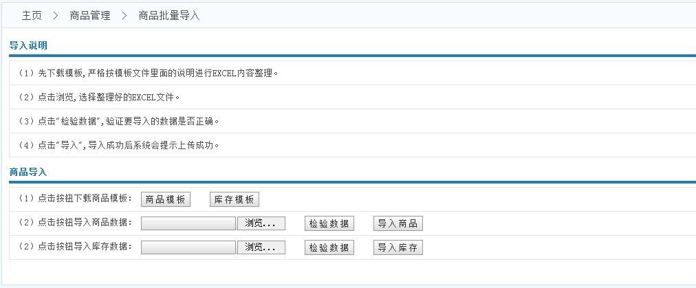 商品模板------>錄入數(shù)據(jù)------>點擊瀏覽------>檢驗數(shù)據(jù)------>導(dǎo)入商品------>導(dǎo)入成功