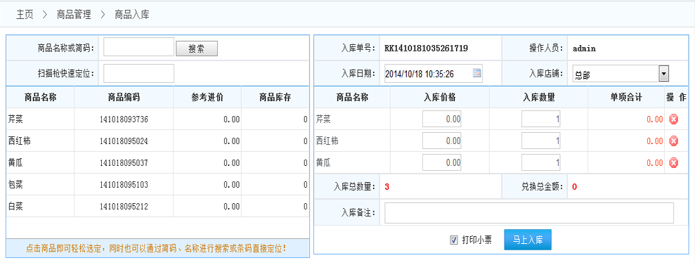 2.選擇商品:在商品列表中 雙擊需要入庫的商品,系統(tǒng)會自動將其加入入庫列表中