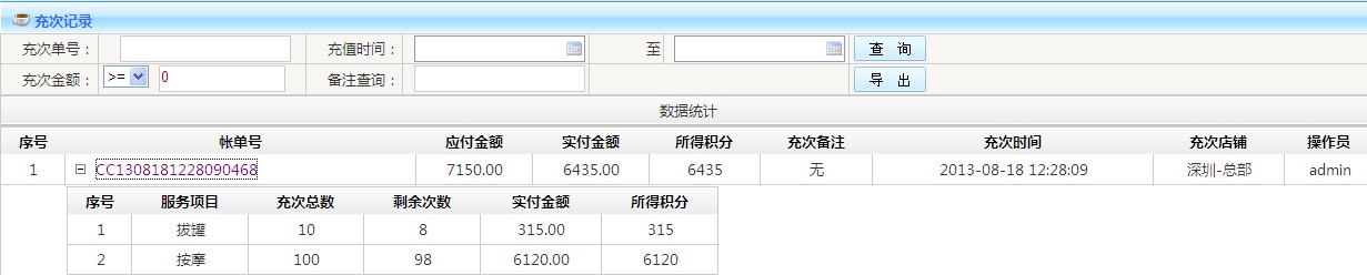 充次記錄: 1.查詢:可以根據(jù)充值單號(hào) 時(shí)間段等條件查詢 2.導(dǎo)出:可以將按條件查詢出來(lái)的數(shù)據(jù),以Excel表格形式導(dǎo)出 3.列表:雙擊充次單號(hào),可以展示出充次詳情